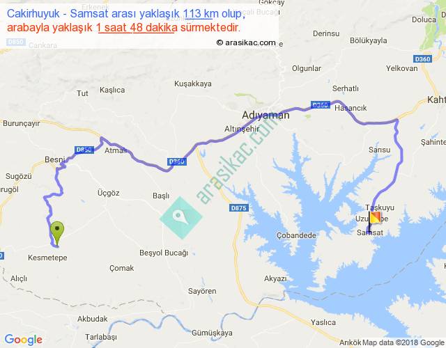Cakirhuyuk - Samsat arası yaklaşık olarak 90 km/h ile yukarıda belirtilen sürede olup, iki yerin kuş uçuşu uzaklığı (mesafesi) 54'dir. Yolculuk otobüsle 2 saat 20 dakika sürmektedir.