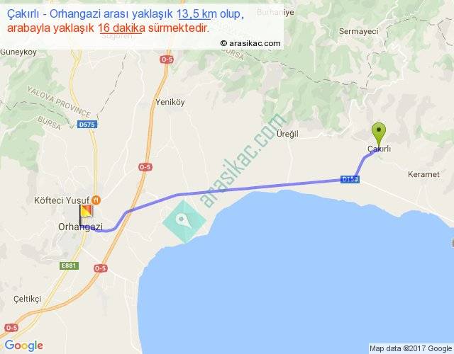 Çakırlı - Orhangazi arası yaklaşık olarak 90 km/h ile yukarıda belirtilen sürede olup, iki yerin kuş uçuşu uzaklığı (mesafesi) 13'dir. Yolculuk otobüsle 20 dakika sürmektedir.
