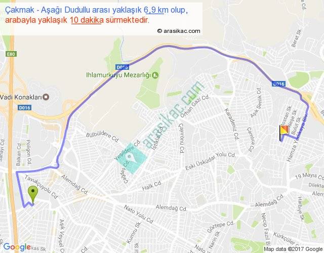 Çakmak - Aşağı Dudullu arası yaklaşık olarak 90 km/h ile yukarıda belirtilen sürede olup, iki yerin kuş uçuşu uzaklığı (mesafesi) 4'dir. Yolculuk otobüsle 13 dakika sürmektedir.