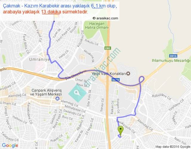 Çakmak - Kazım Karabekir arası yaklaşık olarak 90 km/h ile yukarıda belirtilen sürede olup, iki yerin kuş uçuşu uzaklığı (mesafesi) 3'dir. Yolculuk otobüsle 16 dakika sürmektedir.