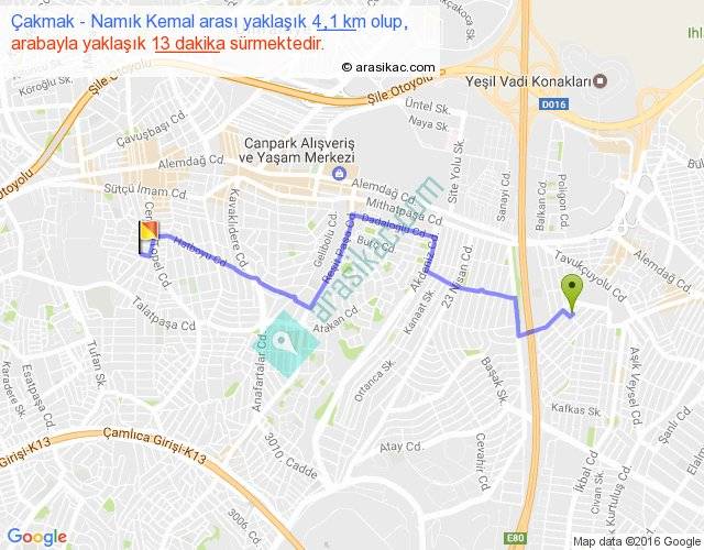 Çakmak - Namık Kemal arası yaklaşık olarak 90 km/h ile yukarıda belirtilen sürede olup, iki yerin kuş uçuşu uzaklığı (mesafesi) 3'dir. Yolculuk otobüsle 16 dakika sürmektedir.