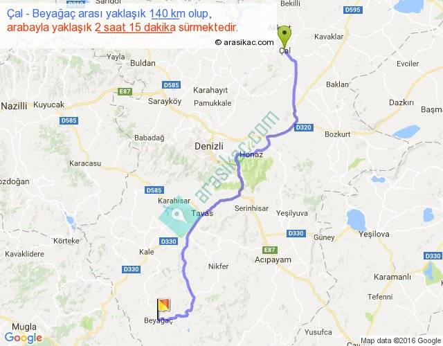 Çal - Beyağaç arası yaklaşık olarak 90 km/h ile yukarıda belirtilen sürede olup, iki yerin kuş uçuşu uzaklığı (mesafesi) 103'dir. Yolculuk otobüsle 2 saat 55 dakika sürmektedir.