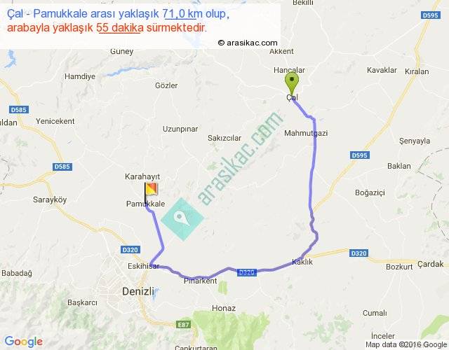 Çal - Pamukkale arası yaklaşık olarak 90 km/h ile yukarıda belirtilen sürede olup, iki yerin kuş uçuşu uzaklığı (mesafesi) 31'dir. Yolculuk otobüsle 1 saat 11 dakika sürmektedir.