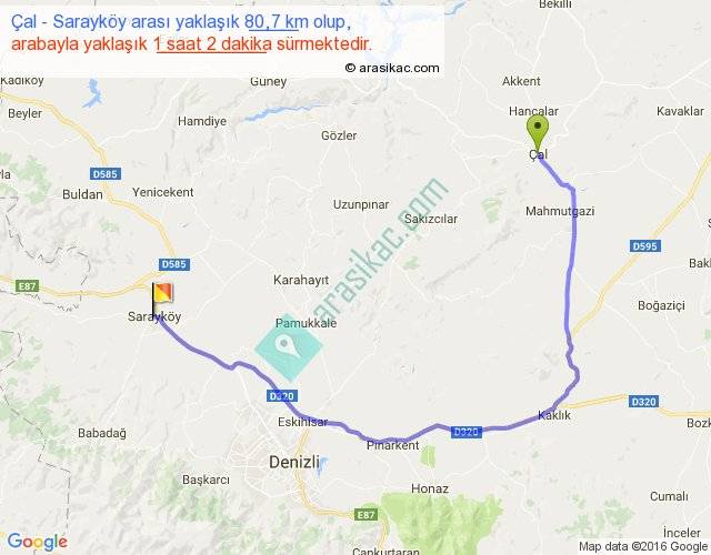 Çal - Sarayköy arası yaklaşık olarak 90 km/h ile yukarıda belirtilen sürede olup, iki yerin kuş uçuşu uzaklığı (mesafesi) 45'dir. Yolculuk otobüsle 1 saat 20 dakika sürmektedir.