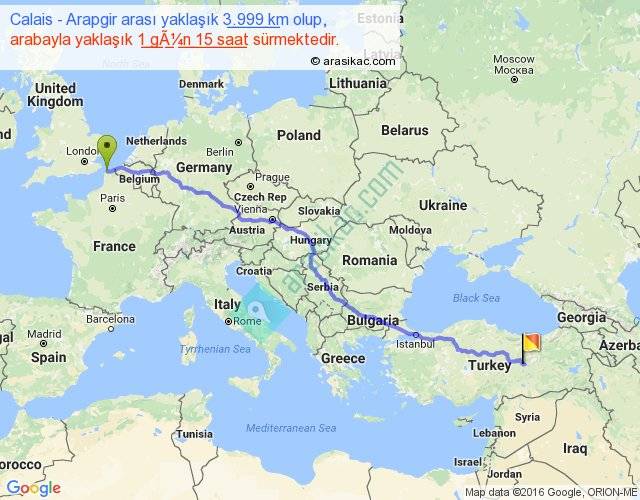 Calais - Arapgir arası yaklaşık olarak 90 km/h ile yukarıda belirtilen sürede olup, iki yerin kuş uçuşu uzaklığı (mesafesi) 3110'dir. Eğer belirtilen yerler arasında uçak seferi var ise bu süre uçakla 4 saat 47 dakika'ya kadar düşebilir. Yolculuk otobüsle 2 gün 2 saat sürmektedir.