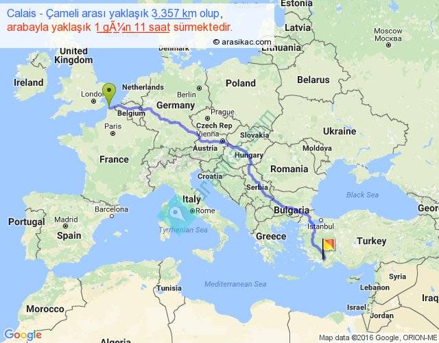 Calais - Çameli arası yaklaşık olarak 90 km/h ile yukarıda belirtilen sürede olup, iki yerin kuş uçuşu uzaklığı (mesafesi) 2645'dir. Eğer belirtilen yerler arasında uçak seferi var ise bu süre uçakla 4 saat 04 dakika'ya kadar düşebilir. Yolculuk otobüsle 1 gün 21 saat sürmektedir.