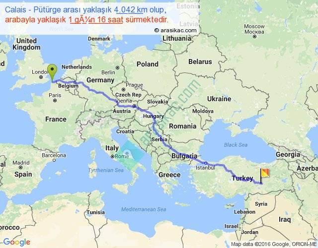 Calais - Pütürge arası yaklaşık olarak 90 km/h ile yukarıda belirtilen sürede olup, iki yerin kuş uçuşu uzaklığı (mesafesi) 3193'dir. Eğer belirtilen yerler arasında uçak seferi var ise bu süre uçakla 4 saat 54 dakika'ya kadar düşebilir. Yolculuk otobüsle 2 gün 4 saat sürmektedir.