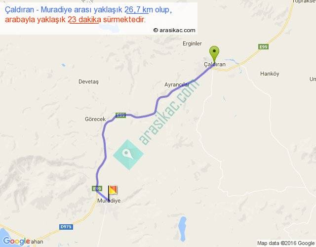 Çaldıran - Muradiye arası yaklaşık olarak 90 km/h ile yukarıda belirtilen sürede olup, iki yerin kuş uçuşu uzaklığı (mesafesi) 21'dir. Yolculuk otobüsle 29 dakika sürmektedir.