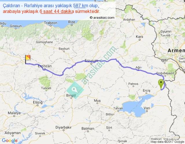 Çaldıran - Refahiye arası yaklaşık olarak 90 km/h ile yukarıda belirtilen sürede olup, iki yerin kuş uçuşu uzaklığı (mesafesi) 447'dir. Eğer belirtilen yerler arasında uçak seferi var ise bu süre uçakla 41 dakika'ya kadar düşebilir. Yolculuk otobüsle 8 saat 45 dakika sürmektedir.