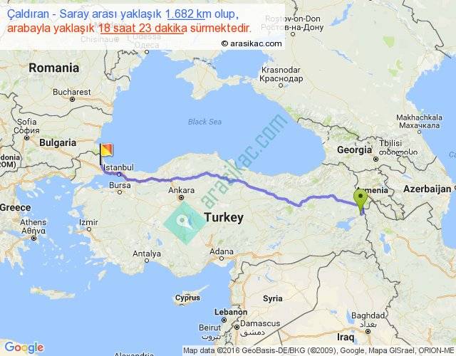 Çaldıran - Saray arası yaklaşık olarak 90 km/h ile yukarıda belirtilen sürede olup, iki yerin kuş uçuşu uzaklığı (mesafesi) 1370'dir. Eğer belirtilen yerler arasında uçak seferi var ise bu süre uçakla 2 saat 06 dakika'ya kadar düşebilir. Yolculuk otobüsle 23 saat 53 dakika sürmektedir.