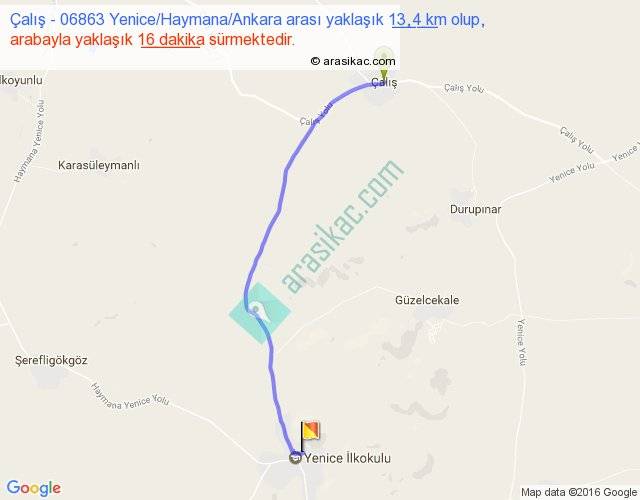 Çalış - 06863 Yenice Haymana Ankara arası yaklaşık olarak 90 km/h ile yukarıda belirtilen sürede olup, iki yerin kuş uçuşu uzaklığı (mesafesi) 11'dir. Yolculuk otobüsle 20 dakika sürmektedir.