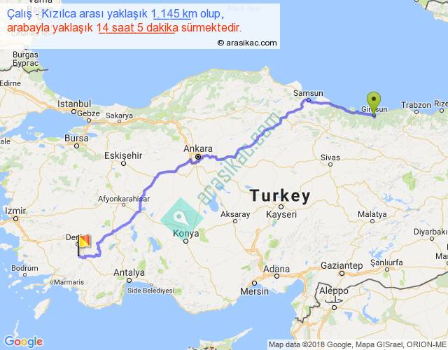Çalış - Kızılca arası yaklaşık olarak 90 km/h ile yukarıda belirtilen sürede olup, iki yerin kuş uçuşu uzaklığı (mesafesi) 877'dir. Eğer belirtilen yerler arasında uçak seferi var ise bu süre uçakla 1 saat 20 dakika'ya kadar düşebilir. Yolculuk otobüsle 18 saat 18 dakika sürmektedir.