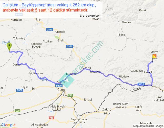Çalışkan - Beytüşşebap arası yaklaşık olarak 90 km/h ile yukarıda belirtilen sürede olup, iki yerin kuş uçuşu uzaklığı (mesafesi) 135'dir. Yolculuk otobüsle 6 saat 45 dakika sürmektedir.