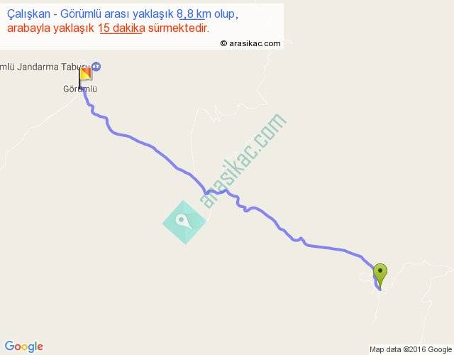 Çalışkan - Görümlü arası yaklaşık olarak 90 km/h ile yukarıda belirtilen sürede olup, iki yerin kuş uçuşu uzaklığı (mesafesi) 8'dir. Yolculuk otobüsle 19 dakika sürmektedir.