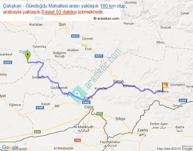 Çalışkan - Gündoğdu Mahallesi arası yaklaşık olarak 90 km/h ile yukarıda belirtilen sürede olup, iki yerin kuş uçuşu uzaklığı (mesafesi) 110'dir. Yolculuk otobüsle 5 saat 2 dakika sürmektedir.