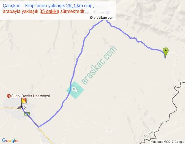 Çalışkan - Silopi arası yaklaşık olarak 90 km/h ile yukarıda belirtilen sürede olup, iki yerin kuş uçuşu uzaklığı (mesafesi) 16'dir. Yolculuk otobüsle 45 dakika sürmektedir.