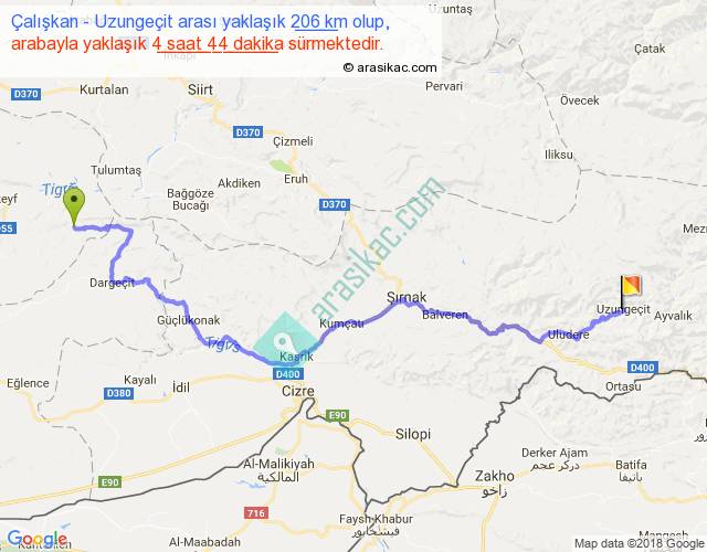 Çalışkan - Uzungeçit arası yaklaşık olarak 90 km/h ile yukarıda belirtilen sürede olup, iki yerin kuş uçuşu uzaklığı (mesafesi) 121'dir. Yolculuk otobüsle 6 saat 9 dakika sürmektedir.