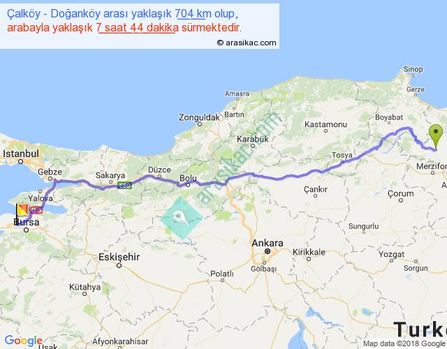 Çalköy - Doğanköy arası yaklaşık olarak 90 km/h ile yukarıda belirtilen sürede olup, iki yerin kuş uçuşu uzaklığı (mesafesi) 560'dir. Eğer belirtilen yerler arasında uçak seferi var ise bu süre uçakla 51 dakika'ya kadar düşebilir. Yolculuk otobüsle 10 saat 3 dakika sürmektedir.
