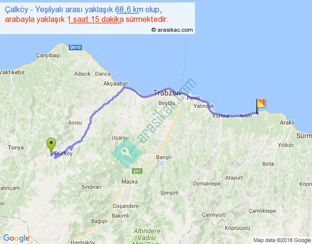 Çalköy - Yeşilyalı arası yaklaşık olarak 90 km/h ile yukarıda belirtilen sürede olup, iki yerin kuş uçuşu uzaklığı (mesafesi) 50'dir. Yolculuk otobüsle 1 saat 37 dakika sürmektedir.