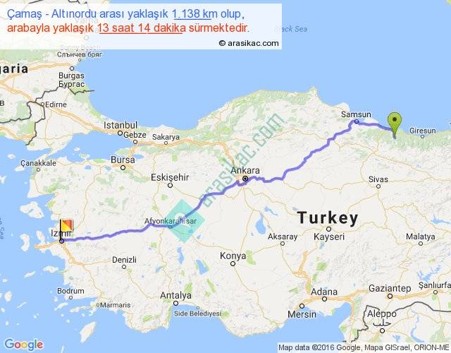 Çamaş - Altınordu arası yaklaşık olarak 90 km/h ile yukarıda belirtilen sürede olup, iki yerin kuş uçuşu uzaklığı (mesafesi) 925'dir. Eğer belirtilen yerler arasında uçak seferi var ise bu süre uçakla 1 saat 25 dakika'ya kadar düşebilir. Yolculuk otobüsle 17 saat 12 dakika sürmektedir.