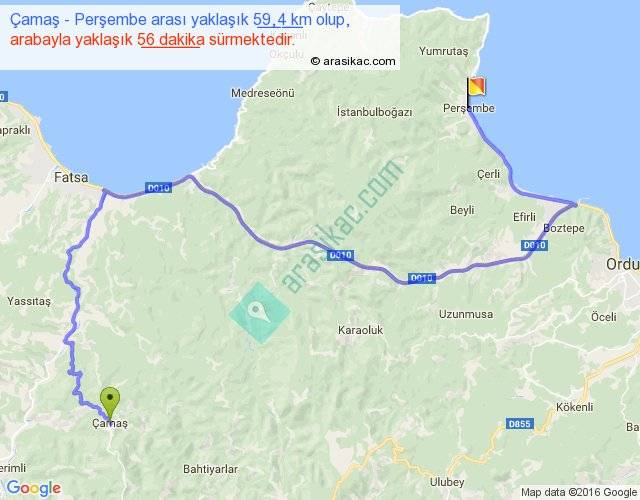 Çamaş - Perşembe arası yaklaşık olarak 90 km/h ile yukarıda belirtilen sürede olup, iki yerin kuş uçuşu uzaklığı (mesafesi) 27'dir. Yolculuk otobüsle 1 saat 12 dakika sürmektedir.