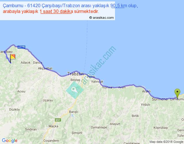 Çamburnu - 61420 Çarşıbaşı Trabzon arası yaklaşık olarak 90 km/h ile yukarıda belirtilen sürede olup, iki yerin kuş uçuşu uzaklığı (mesafesi) 68'dir. Yolculuk otobüsle 1 saat 57 dakika sürmektedir.