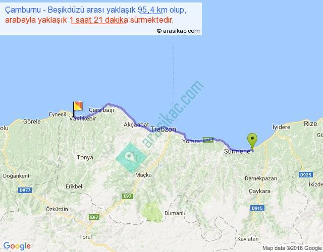 Çamburnu - Beşikdüzü arası yaklaşık olarak 90 km/h ile yukarıda belirtilen sürede olup, iki yerin kuş uçuşu uzaklığı (mesafesi) 83'dir. Yolculuk otobüsle 1 saat 45 dakika sürmektedir.