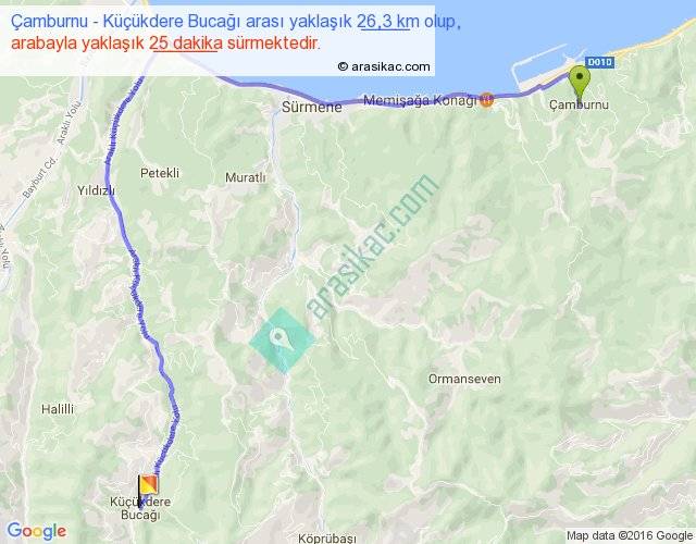 Çamburnu - Küçükdere Bucağı arası yaklaşık olarak 90 km/h ile yukarıda belirtilen sürede olup, iki yerin kuş uçuşu uzaklığı (mesafesi) 16'dir. Yolculuk otobüsle 32 dakika sürmektedir.
