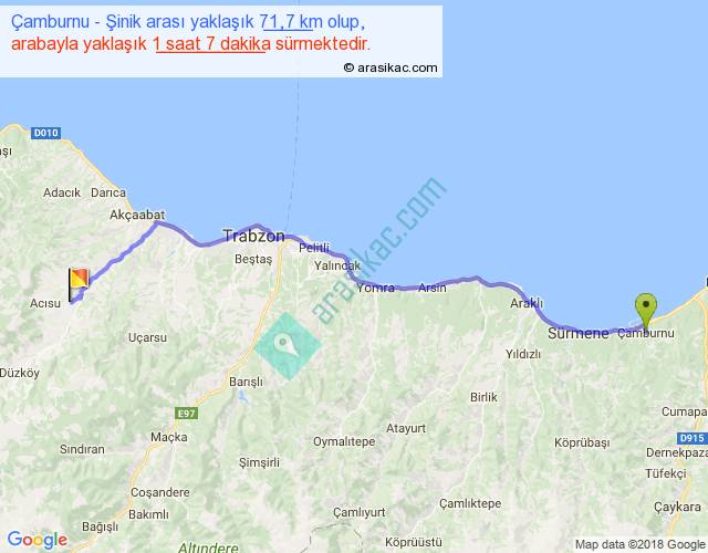 Çamburnu - Şinik arası yaklaşık olarak 90 km/h ile yukarıda belirtilen sürede olup, iki yerin kuş uçuşu uzaklığı (mesafesi) 60'dir. Yolculuk otobüsle 1 saat 27 dakika sürmektedir.