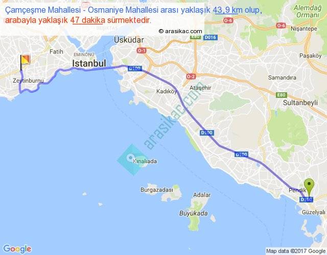 Çamçeşme Mahallesi - Osmaniye Mahallesi arası yaklaşık olarak 90 km/h ile yukarıda belirtilen sürede olup, iki yerin kuş uçuşu uzaklığı (mesafesi) 35'dir. Yolculuk otobüsle 1 saat 1 dakika sürmektedir.
