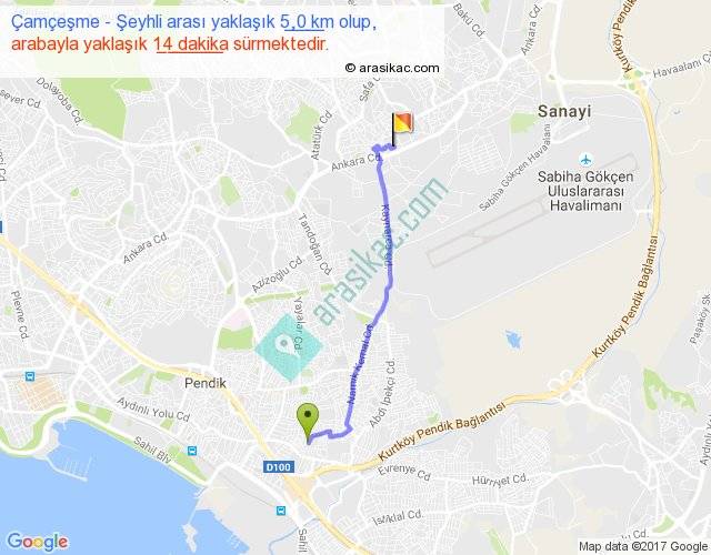 Çamçeşme - Şeyhli arası yaklaşık olarak 90 km/h ile yukarıda belirtilen sürede olup, iki yerin kuş uçuşu uzaklığı (mesafesi) 4'dir. Yolculuk otobüsle 18 dakika sürmektedir.