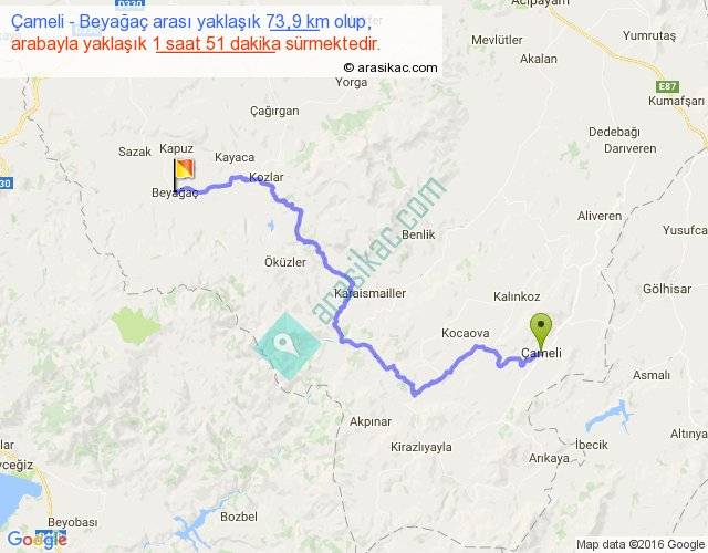 Çameli - Beyağaç arası yaklaşık olarak 90 km/h ile yukarıda belirtilen sürede olup, iki yerin kuş uçuşu uzaklığı (mesafesi) 44'dir. Yolculuk otobüsle 2 saat 24 dakika sürmektedir.