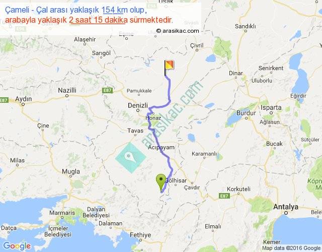 Çameli - Çal arası yaklaşık olarak 90 km/h ile yukarıda belirtilen sürede olup, iki yerin kuş uçuşu uzaklığı (mesafesi) 111'dir. Yolculuk otobüsle 2 saat 55 dakika sürmektedir.