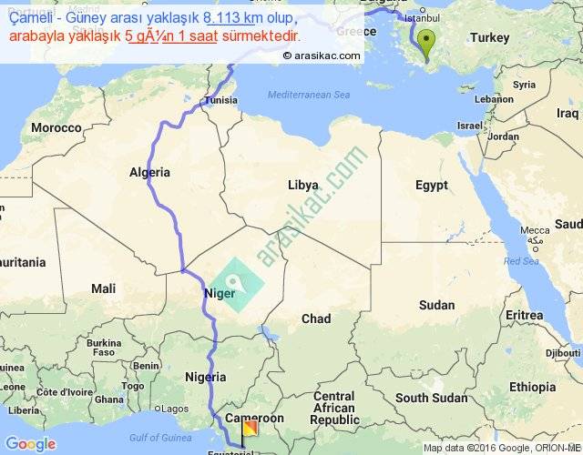 Çameli - Güney arası yaklaşık olarak 90 km/h ile yukarıda belirtilen sürede olup, iki yerin kuş uçuşu uzaklığı (mesafesi) 4197'dir. Eğer belirtilen yerler arasında uçak seferi var ise bu süre uçakla 6 saat 27 dakika'ya kadar düşebilir. Yolculuk otobüsle 6 gün 13 saat sürmektedir.