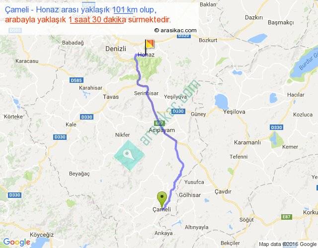 Çameli - Honaz arası yaklaşık olarak 90 km/h ile yukarıda belirtilen sürede olup, iki yerin kuş uçuşu uzaklığı (mesafesi) 76'dir. Yolculuk otobüsle 1 saat 57 dakika sürmektedir.