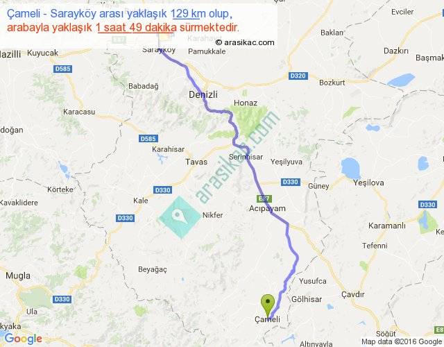 Çameli - Sarayköy arası yaklaşık olarak 90 km/h ile yukarıda belirtilen sürede olup, iki yerin kuş uçuşu uzaklığı (mesafesi) 101'dir. Yolculuk otobüsle 2 saat 21 dakika sürmektedir.