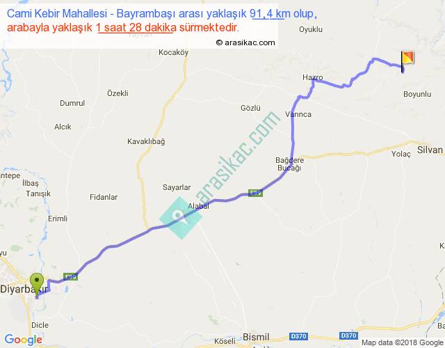 Cami Kebir Mahallesi - Bayrambaşı arası yaklaşık olarak 90 km/h ile yukarıda belirtilen sürede olup, iki yerin kuş uçuşu uzaklığı (mesafesi) 74'dir. Yolculuk otobüsle 1 saat 54 dakika sürmektedir.