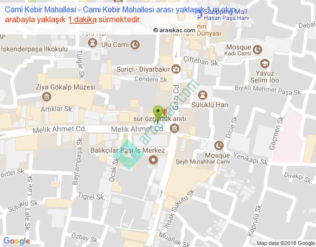 Cami Kebir Mahallesi - Cami Kebir Mahallesi arası yaklaşık olarak 90 km/h ile yukarıda belirtilen sürede olup, iki yerin kuş uçuşu uzaklığı (mesafesi) 0'dir. Yolculuk otobüsle 1 dakika sürmektedir.