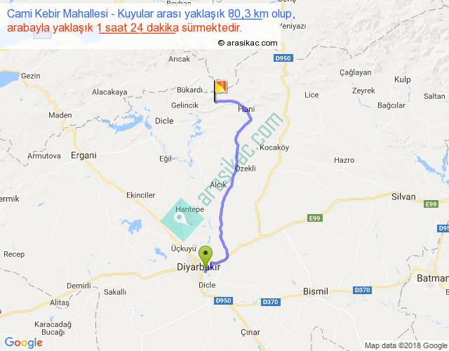 Cami Kebir Mahallesi - Kuyular arası yaklaşık olarak 90 km/h ile yukarıda belirtilen sürede olup, iki yerin kuş uçuşu uzaklığı (mesafesi) 58'dir. Yolculuk otobüsle 1 saat 49 dakika sürmektedir.