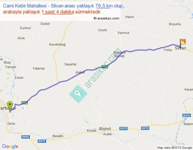 Cami Kebir Mahallesi - Silvan arası yaklaşık olarak 90 km/h ile yukarıda belirtilen sürede olup, iki yerin kuş uçuşu uzaklığı (mesafesi) 72'dir. Yolculuk otobüsle 1 saat 23 dakika sürmektedir.