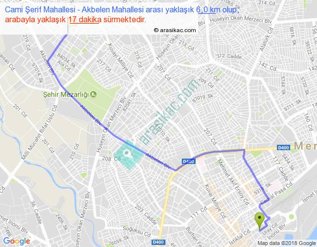 Cami Şerif Mahallesi - Akbelen Mahallesi arası yaklaşık olarak 90 km/h ile yukarıda belirtilen sürede olup, iki yerin kuş uçuşu uzaklığı (mesafesi) 4'dir. Yolculuk otobüsle 22 dakika sürmektedir.