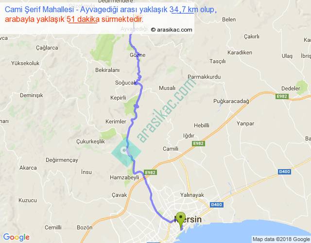 Cami Şerif Mahallesi - Ayvagediği arası yaklaşık olarak 90 km/h ile yukarıda belirtilen sürede olup, iki yerin kuş uçuşu uzaklığı (mesafesi) 26'dir. Yolculuk otobüsle 1 saat 6 dakika sürmektedir.
