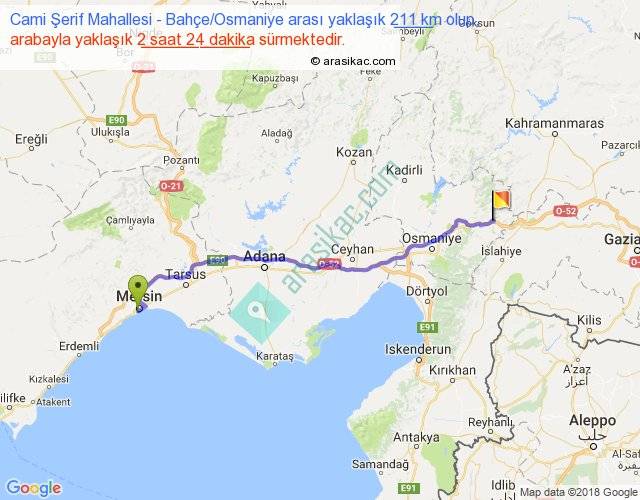 Cami Şerif Mahallesi - Bahçe Osmaniye arası yaklaşık olarak 90 km/h ile yukarıda belirtilen sürede olup, iki yerin kuş uçuşu uzaklığı (mesafesi) 178'dir. Yolculuk otobüsle 3 saat 7 dakika sürmektedir.