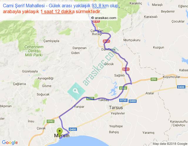 Cami Şerif Mahallesi - Gülek arası yaklaşık olarak 90 km/h ile yukarıda belirtilen sürede olup, iki yerin kuş uçuşu uzaklığı (mesafesi) 52'dir. Yolculuk otobüsle 1 saat 33 dakika sürmektedir.