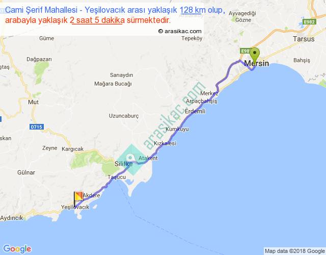 Cami Şerif Mahallesi - Yeşilovacık arası yaklaşık olarak 90 km/h ile yukarıda belirtilen sürede olup, iki yerin kuş uçuşu uzaklığı (mesafesi) 110'dir. Yolculuk otobüsle 2 saat 42 dakika sürmektedir.