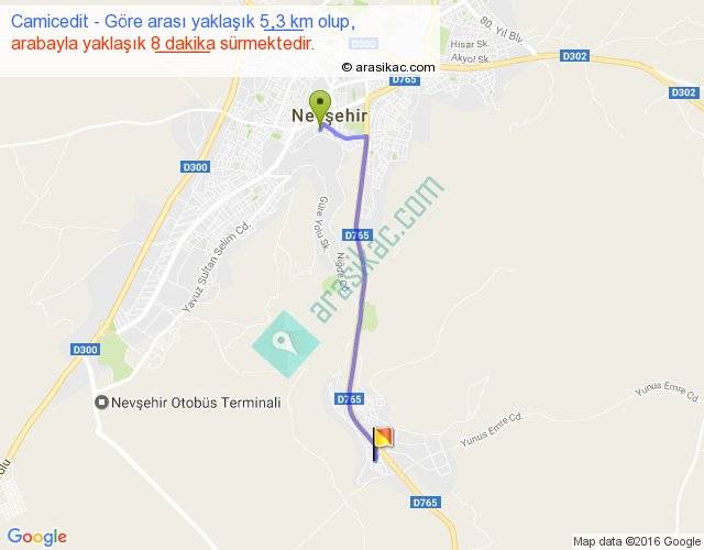 Camicedit - Göre arası yaklaşık olarak 90 km/h ile yukarıda belirtilen sürede olup, iki yerin kuş uçuşu uzaklığı (mesafesi) 5'dir. Yolculuk otobüsle 10 dakika sürmektedir.