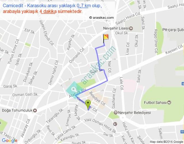 Camicedit - Karasoku arası yaklaşık olarak 90 km/h ile yukarıda belirtilen sürede olup, iki yerin kuş uçuşu uzaklığı (mesafesi) 0'dir. Yolculuk otobüsle 5 dakika sürmektedir.