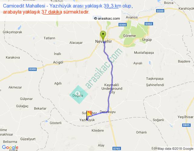 Camicedit Mahallesi - Yazıhüyük arası yaklaşık olarak 90 km/h ile yukarıda belirtilen sürede olup, iki yerin kuş uçuşu uzaklığı (mesafesi) 31'dir. Yolculuk otobüsle 48 dakika sürmektedir.