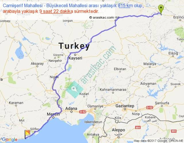 Camiişerif Mahallesi - Büyükeceli Mahallesi arası yaklaşık olarak 90 km/h ile yukarıda belirtilen sürede olup, iki yerin kuş uçuşu uzaklığı (mesafesi) 612'dir. Eğer belirtilen yerler arasında uçak seferi var ise bu süre uçakla 56 dakika'ya kadar düşebilir. Yolculuk otobüsle 12 saat 10 dakika sürmektedir.