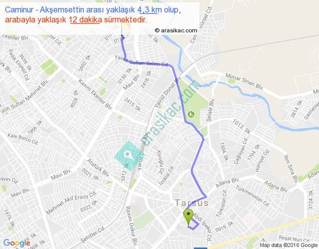 Caminur - Akşemsettin arası yaklaşık olarak 90 km/h ile yukarıda belirtilen sürede olup, iki yerin kuş uçuşu uzaklığı (mesafesi) 3'dir. Yolculuk otobüsle 15 dakika sürmektedir.